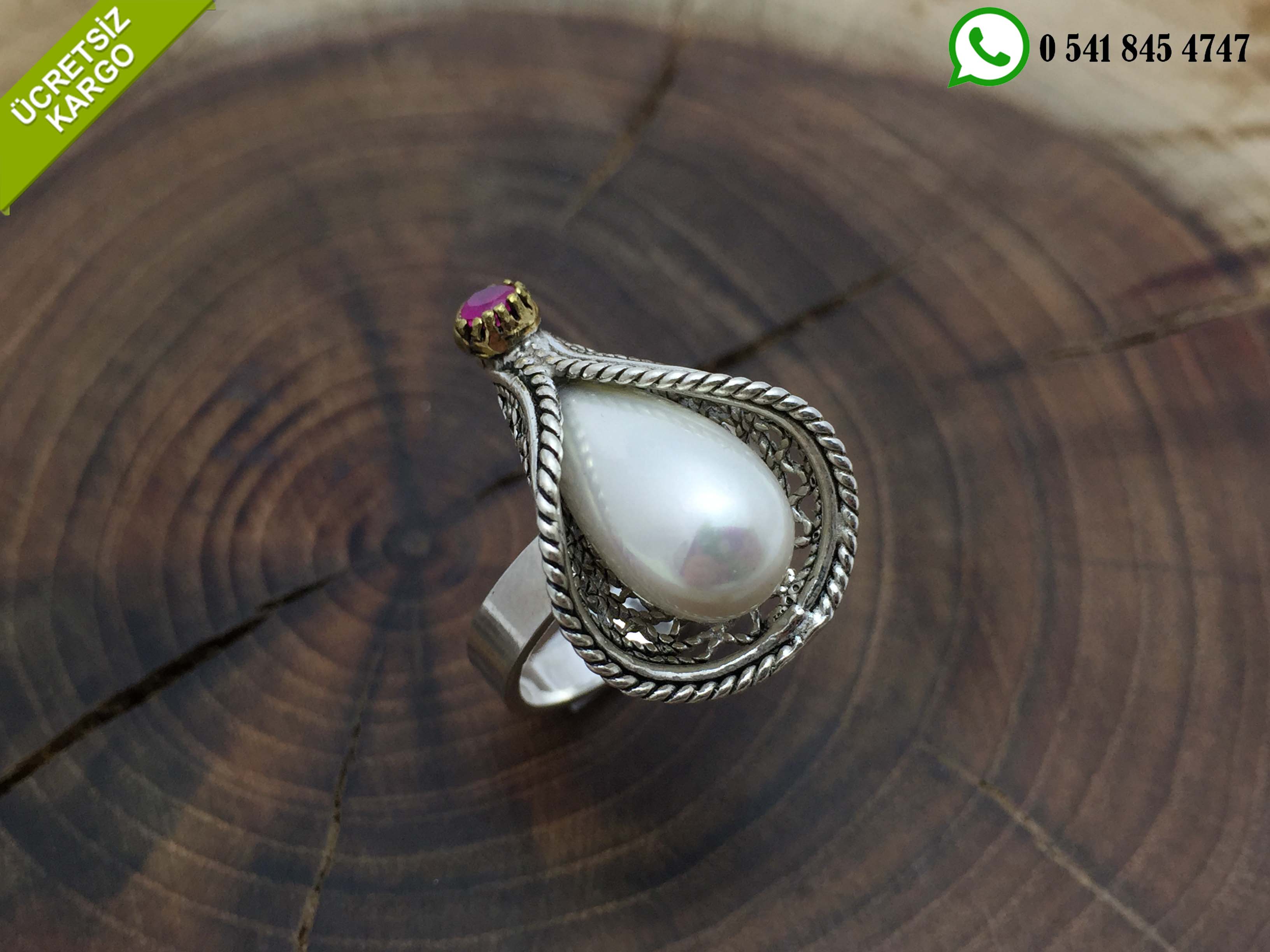 Yakut Ve İnci Taşlı Oksitli Telkari Bayan Gümüş Yüzük Stok Kodu:20171866